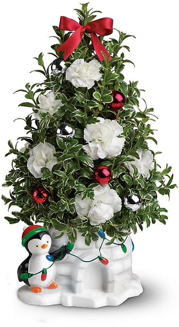 Let your holiday spirit shine! Everyone loves this jolly little penguin, stringing Christmas lights around his cozy igloo beneath a fresh "tree" of lush oregonia and snow white carnations. Adorned with bright ornaments, it's a whimsical winter celebration!
