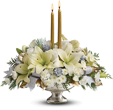 Celebrate the season with this majestic centerpiece of sparkling silver and glamorous gold. Bright white lilies and winter greens arranged in a shimmering mercury glass bowl will cast a lovely light on any holiday table.